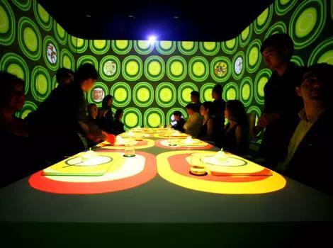 這不像餐廳,卻是一個類似「駭客帝國」電影里的科幻實驗室,「純白色,未來感」是首先蹦入我腦海的兩個詞。位于這個高聳白色空間的正中央,是一種類似「會議室」的擺設——一個巨大的白色長桌和10張白色工作椅。頭頂上,是多部投影機和鎂光燈組成的,空氣中散發著某些未知香料的味道,這一切,都活似一個拍攝未來風格電影的制片廠。