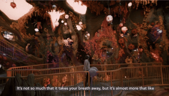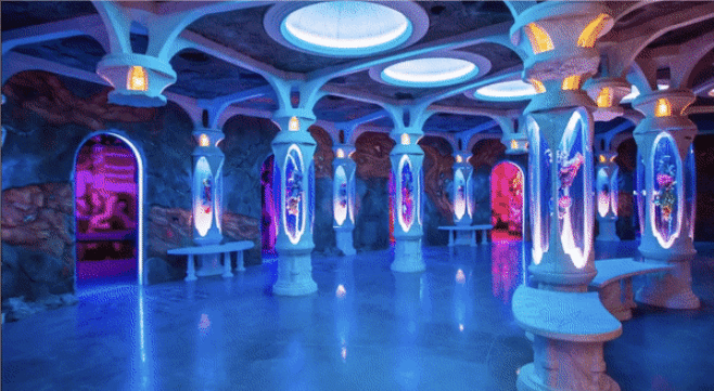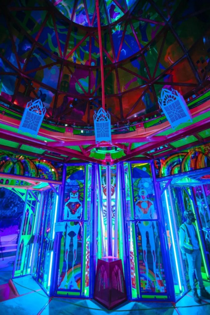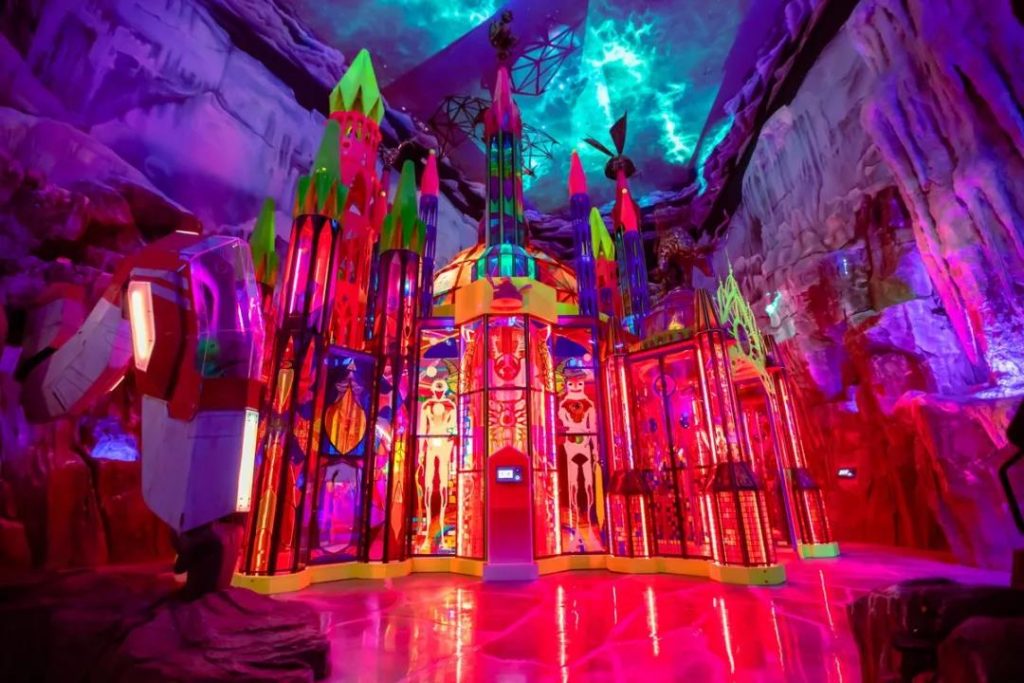 緊接著,游客來到一座33英尺高的哥特式“大教堂”“Eenia”前,通過數字創意影像打造的彩色玻璃花窗讓你置身于七彩萬花筒中;打開這個教堂的大門,仿佛穿越回到14世紀的歐洲世界。