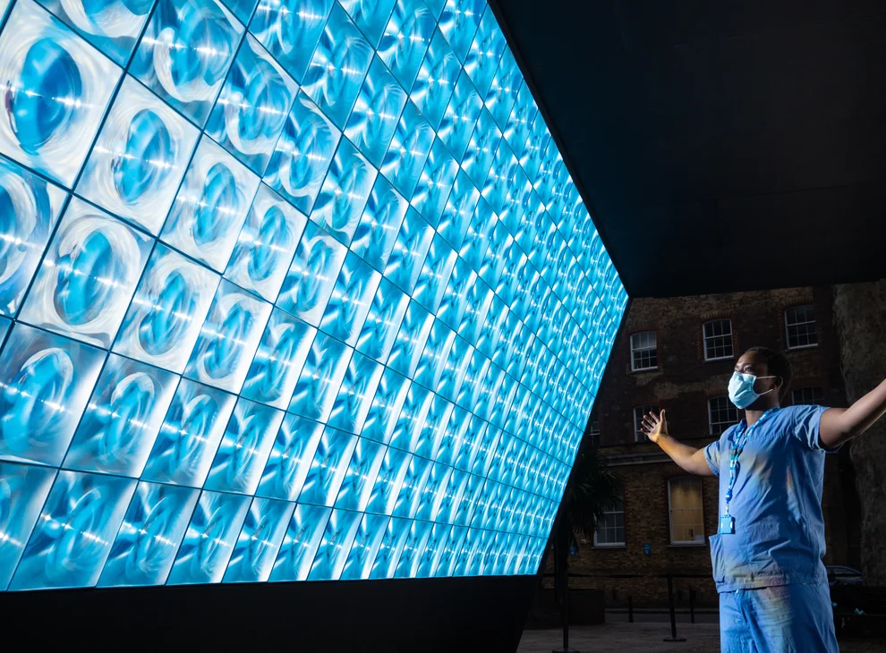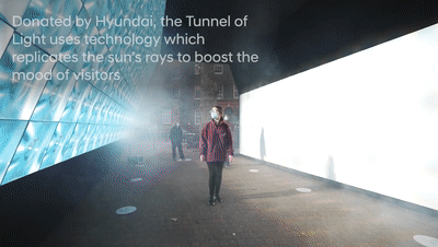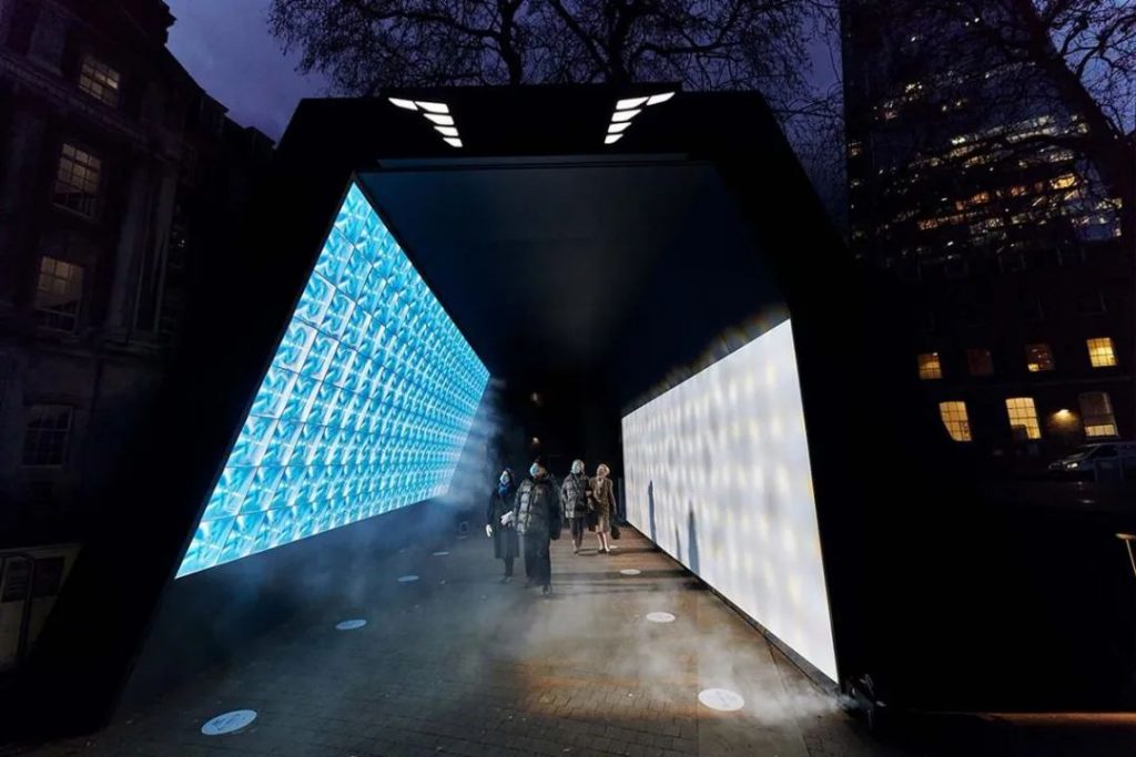 英國Squidsoup工作室創作的沉浸式燈光裝置《Tunnel of light》在倫敦蓋伊和圣托馬斯醫院展出,以紀念NHS完成10萬新冠疫苗接種的里程碑,預示著市民即將回歸正常生活。