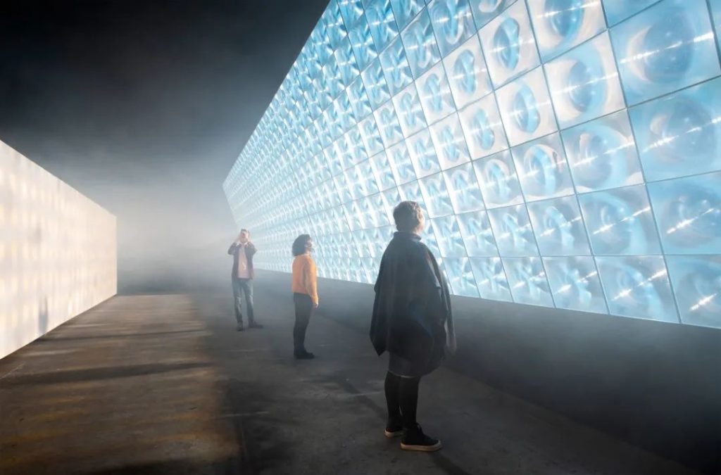 9米長的隧道裝置,包含有160個“陽光像素”燈箱,占地25平方米。人們可以在隧道里游走,用手去碰觸陽光,也可以直接穿過光線。