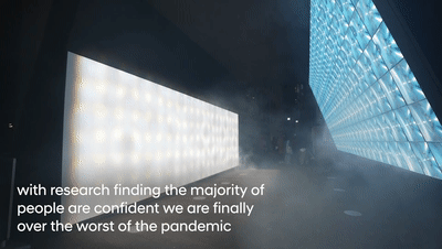 進入裝置內部,蔚藍色的數字科技燈箱模仿出人造太陽的溫暖,營造出穿過云層的陽光的錯覺,這是我們逐步退出鎖定狀態并回歸正常生活的恰當比喻。