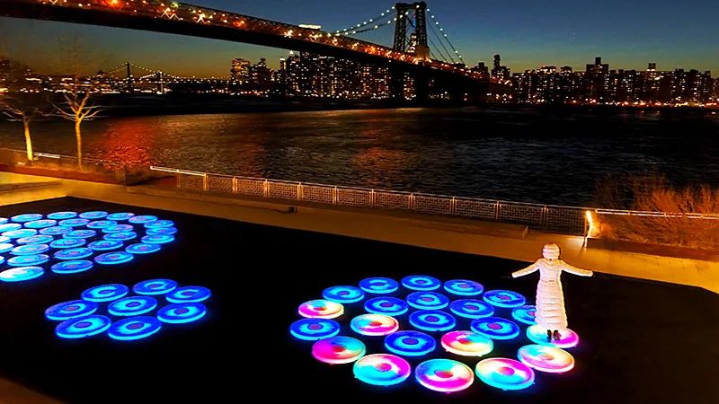 這座雕塑占地2400平方英尺,由三個同心圓組成,每個同心圓由互動平臺組成,響應游客的腳步,觸發光的飛濺,創造出不斷變化的構圖。