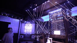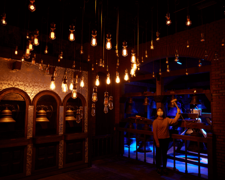 此外,還有一個(gè)高達(dá)9m的宏偉鐘琴裝置。當(dāng)你走進(jìn)觸發(fā)裝置時(shí),一場鐘琴與燈光的大秀將精彩上演,在光影中古樸、沉穩(wěn)、大氣。