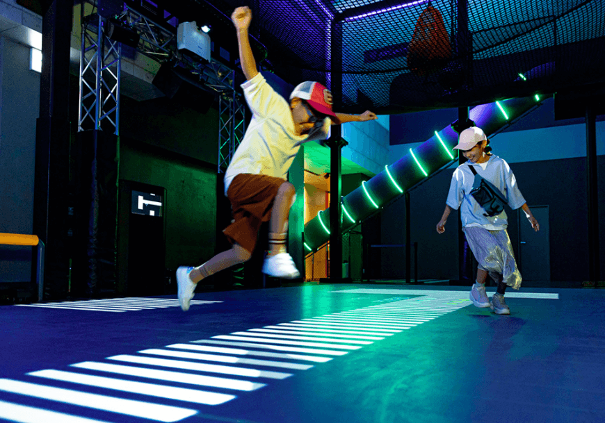 類似于光影互動(dòng)版本的跳房子和躲避球,需要避開四面八方接近的光線,是非常適合親子游玩的項(xiàng)目。