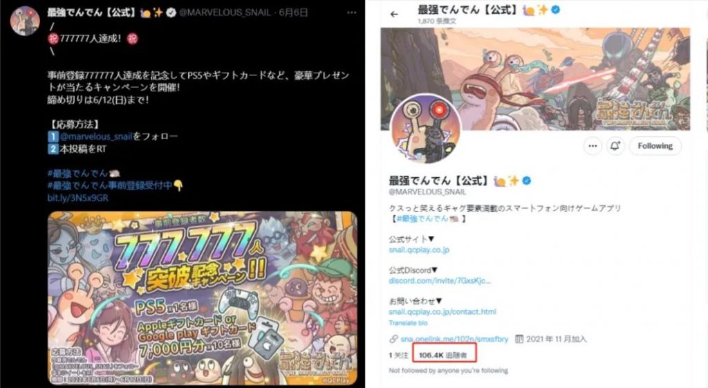 -本次裸眼3D大屏秀上線后,《最強蝸牛》官方推特的粉絲數極快達到10w+,游戲預約人數在6月6日就已突破777777,目前注冊用戶已突破100萬,成績非常亮眼。