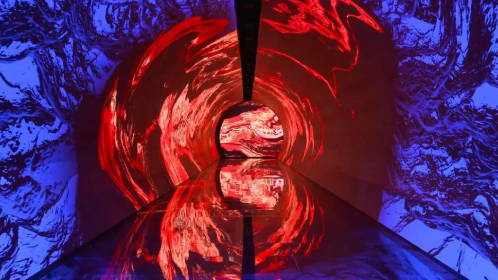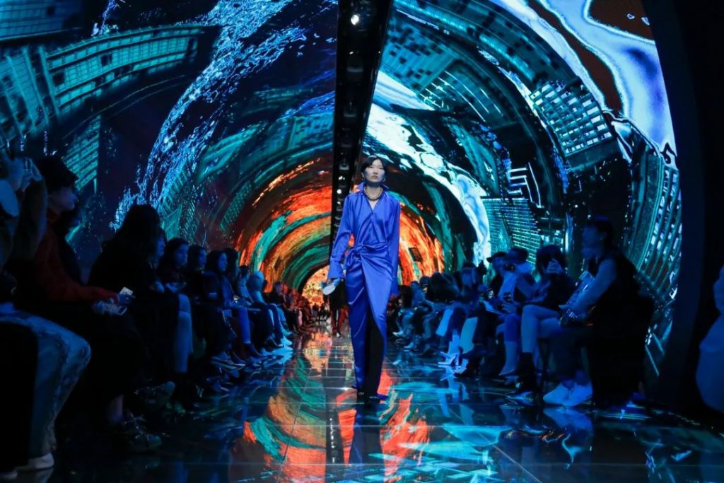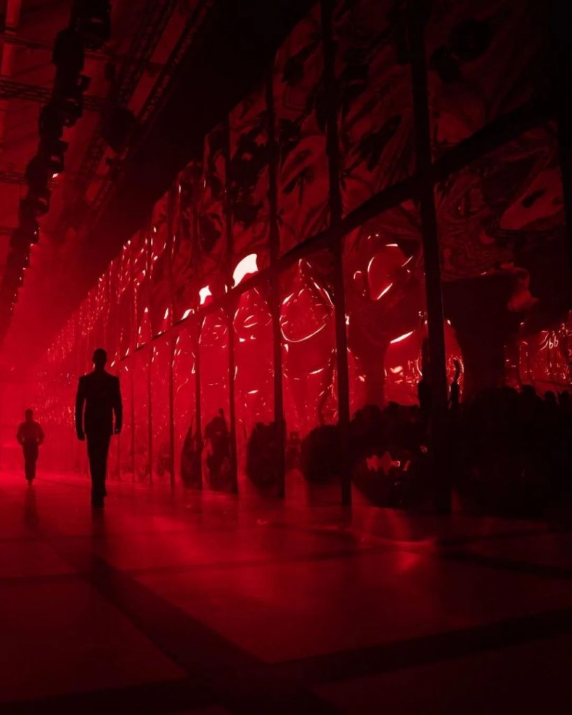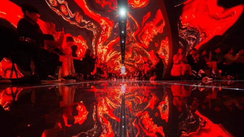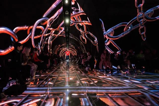 模特穿過(guò)視頻屏幕的2000平方米隧道,伴隨波浪、熔巖流動(dòng)、行星形成然后融化,色彩的沖擊產(chǎn)生了真實(shí)的烏托邦,讓觀眾沉溺于宇宙混沌之中。