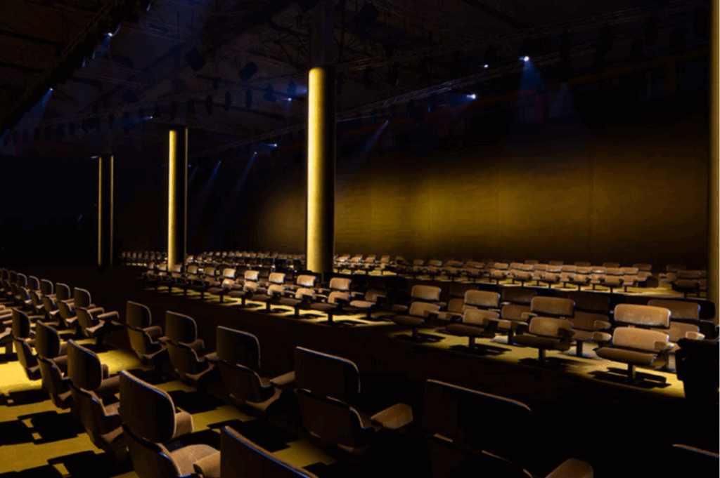 設(shè)計(jì)團(tuán)隊(duì)將秀場(chǎng)空間翻新后重新設(shè)想為“stage for action”,用橄欖綠色地毯覆蓋T臺(tái),并將一排排豪華的劇院座位錯(cuò)落排布。由一條霓虹燈和金屬格柵組成未來(lái)感隧道為走秀起點(diǎn),詮釋其未來(lái)主義的設(shè)計(jì)理念。