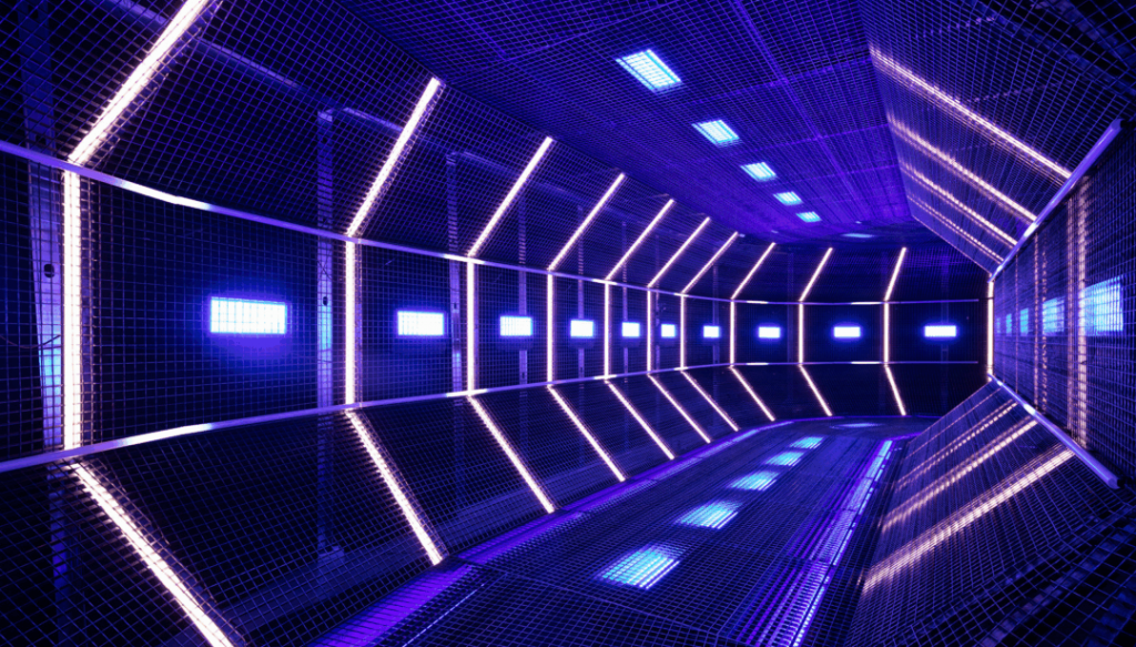 觀眾分別坐在隧道內(nèi)部?jī)蓚?cè),地板和曲面墻壁以及天花板全部被LED顯示屏包裹,配合著變幻莫測(cè)的視頻圖像,使人們仿佛置身于一個(gè)夢(mèng)幻的科幻世界。