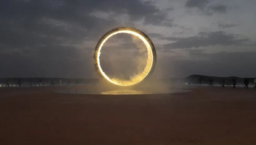 演出即將接近尾聲時(shí),一個(gè)史詩(shī)般巨型的光圈在其內(nèi)部邊緣被照亮——從沙漠中的圓形水潭中緩緩升起、旋轉(zhuǎn)并散發(fā)出霧氣,電子鼓點(diǎn)聲和悠揚(yáng)的古典音樂(lè)交織其間。