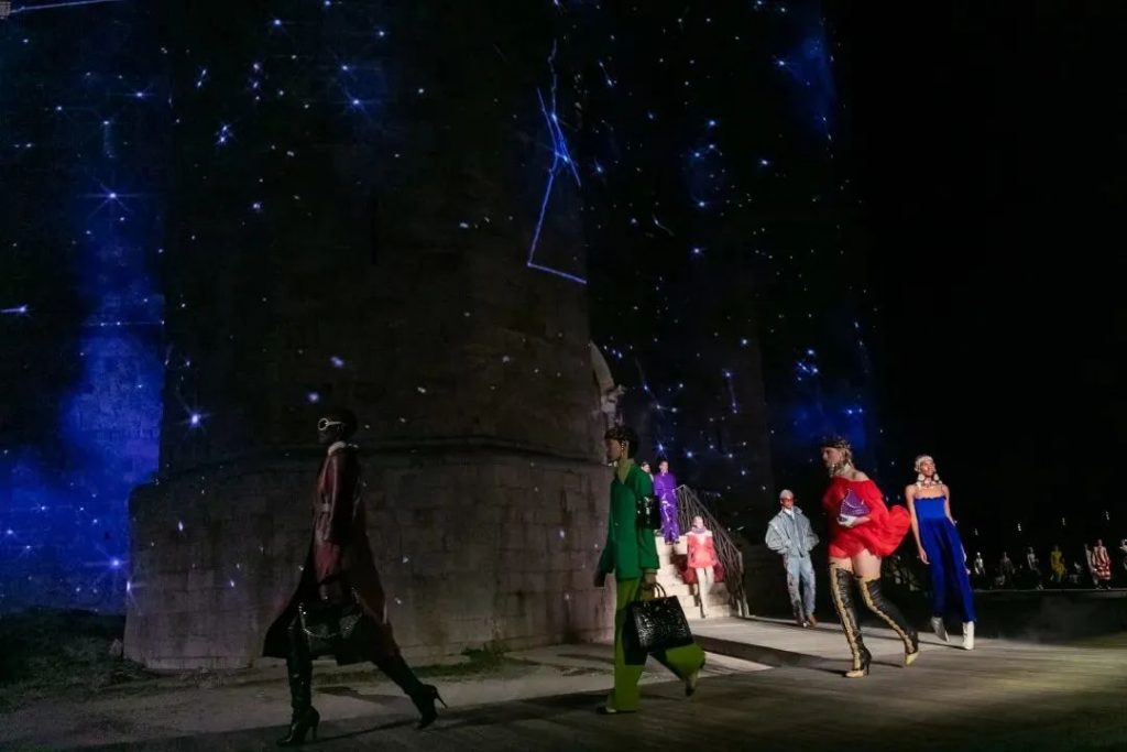 創(chuàng)作總監(jiān)Alessandro Michele將其作為主題,用他一貫擅長(zhǎng)的極繁美學(xué),通過(guò)創(chuàng)意投影、燈光藝術(shù)重塑宇宙星河在城堡上空盤(pán)旋,帶來(lái)一場(chǎng)以時(shí)裝、文學(xué)、藝術(shù)、宗教、符號(hào)等相聯(lián)結(jié)的時(shí)裝秀。
