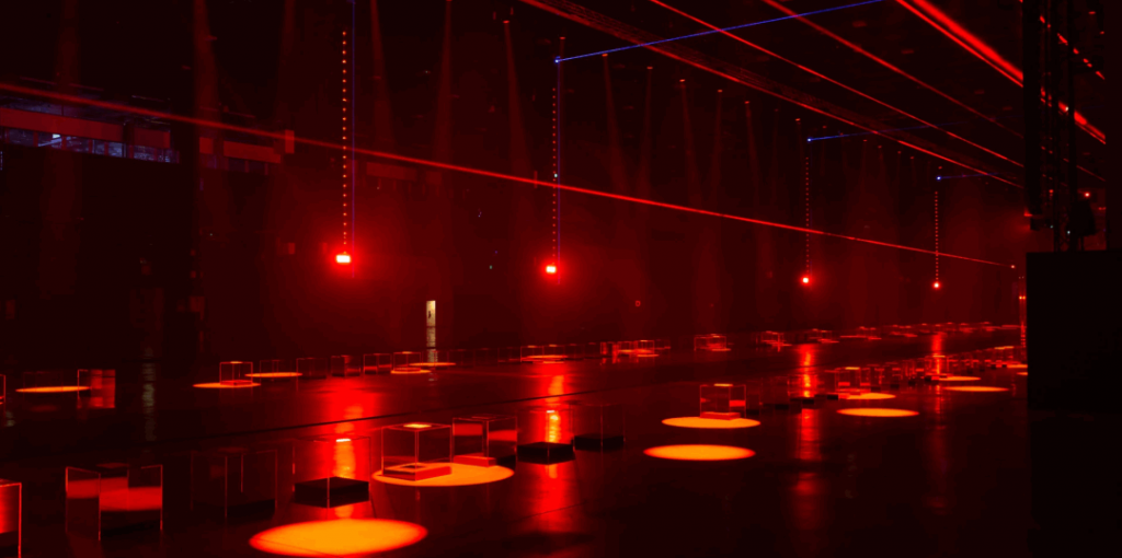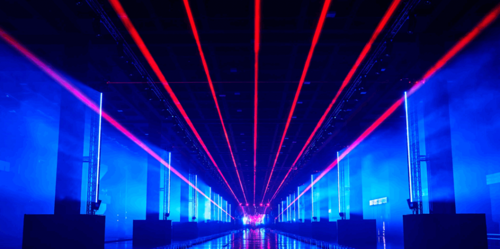 法拉利作為運(yùn)動(dòng)、速度的代名詞,秀場(chǎng)布景也呈現(xiàn)出利落、動(dòng)感的氛圍,全場(chǎng)幾乎被動(dòng)感燈光包裹,以品牌標(biāo)志性燈光顏色開(kāi)場(chǎng),走秀展示伴隨著激烈的燈光節(jié)奏進(jìn)行,充分貫徹法拉利的品牌風(fēng)格。