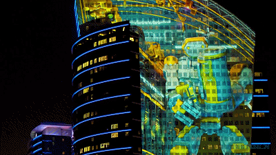 迪拜Festival City舉辦的一場水幕光影秀,這個作品是由Laservision Mega Media團隊設(shè)計創(chuàng)作,其靈感來源于一個影像故事’A Child’s Dream’,故事講述的是一個小男孩通過飛機、鯨魚、樹屋和跳舞的機器人等這些虛構(gòu)的事物來譜寫他的神奇之旅。