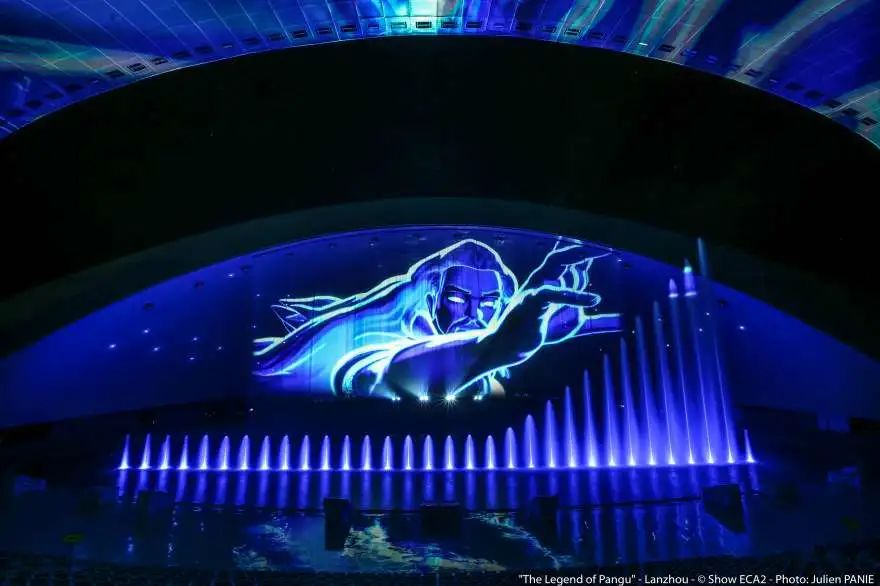 The Legend Of Pangu,旨在將游客帶到中國偏遠地區(qū),延長他們在當(dāng)?shù)氐穆糜瓮A魰r間,ECA2多媒體數(shù)字藝術(shù)團隊借鑒了一個廣為流傳的傳說,以投影和音頻解說為基礎(chǔ),并加入激光、燈光、水效、霧、火效和煙火精心打造了一個沉浸式的水幕光影秀奇觀。