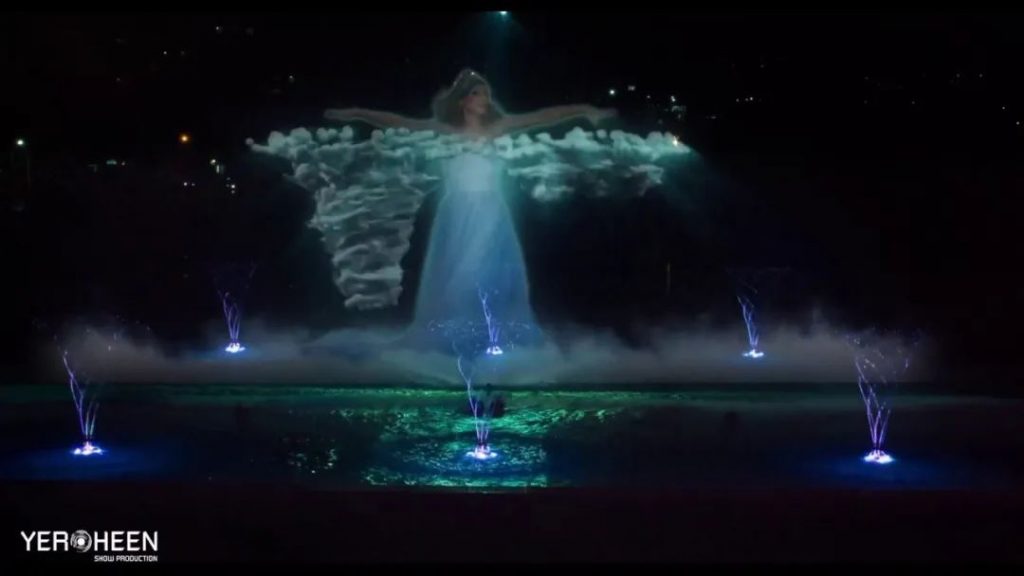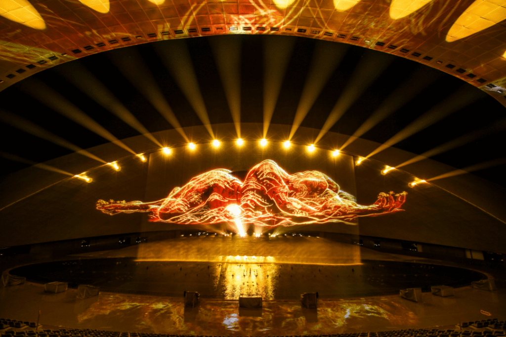 借助中國民間廣為流傳的傳說,ECA2 發(fā)明了緊貼建筑物的雙曲線屏供高清視頻投影,混合霧氣和煙霧發(fā)明新的“噴射霧”效果,獨創(chuàng)了960平米全球最大的單一水幕投影面,使得激光、燈光和 Mapping 可以更好地呈現(xiàn)。精心打造了一個沉浸式的奇觀,將觀眾包裹在聲音和視覺中。