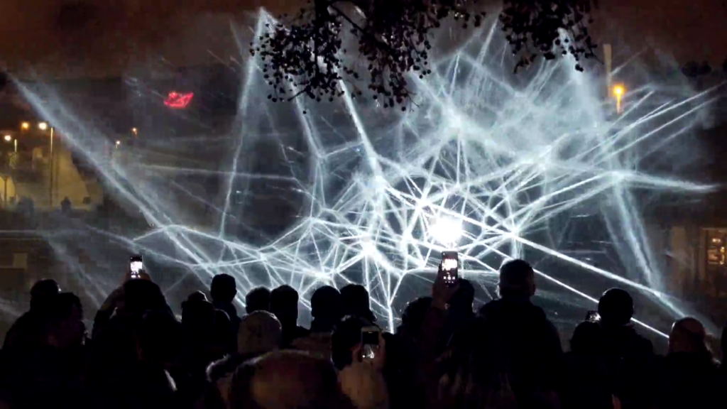 法國藝術(shù)家Joanie Lemercier設(shè)計的戶外視聽裝置“Constellations,有別于普通的水幕投影,將三維燈光投射到水中,使它具有波紋的全息效果,結(jié)合電子音樂在空氣中形成不同的形狀和結(jié)構(gòu),水,光,物質(zhì),它們的碰撞總有數(shù)不盡的驚喜。