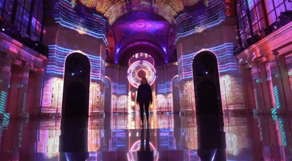 創(chuàng)作團隊通過360°投影貼圖,交互式視覺效果,照明,場景設計和身臨其境的聲音融合在一起,創(chuàng)造了一種使感官愉悅的體驗。為了突出建筑物的雄偉內部,該團隊創(chuàng)造了五個獨特的環(huán)境,每個環(huán)境都有獨特的敘述。