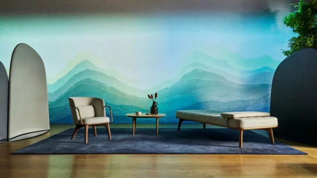 投射在床尾的影像從大自然中汲取靈感,平緩的丘陵,綿延的峻嶺,以及無(wú)波的湖水……環(huán)繞式音箱播放的自然之聲,像繭一樣包裹著游客,游客能從心感受重?fù)?dān)從肩頭卸下的輕松感,達(dá)到身心健康的療愈。