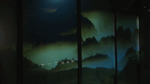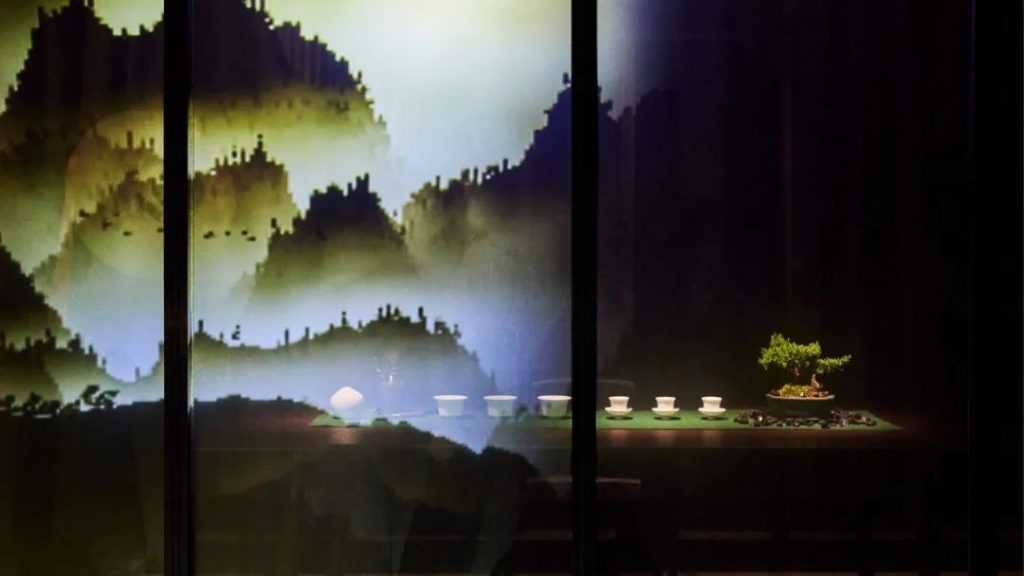 水墨形式的靈感來(lái)自亞洲的茶文化傳統(tǒng),當(dāng)游客在這個(gè)空間內(nèi)移動(dòng)時(shí),交互式屏幕會(huì)對(duì)游客動(dòng)作做出反應(yīng),朦朧煙霧慢慢消散,遠(yuǎn)處的山景逐漸顯現(xiàn)。