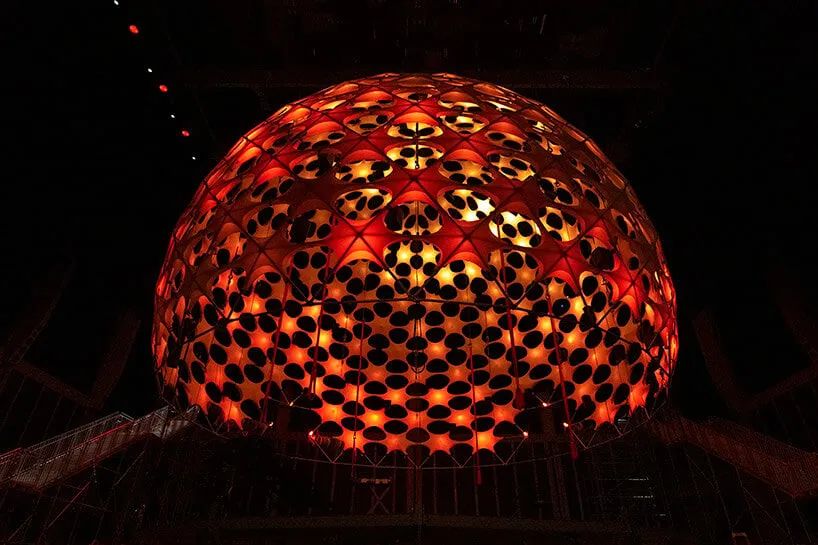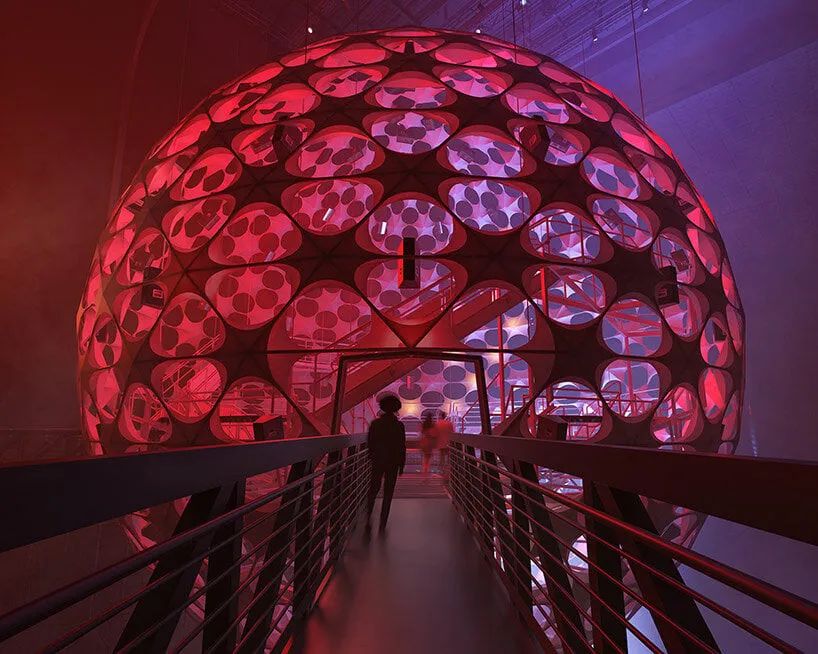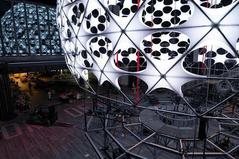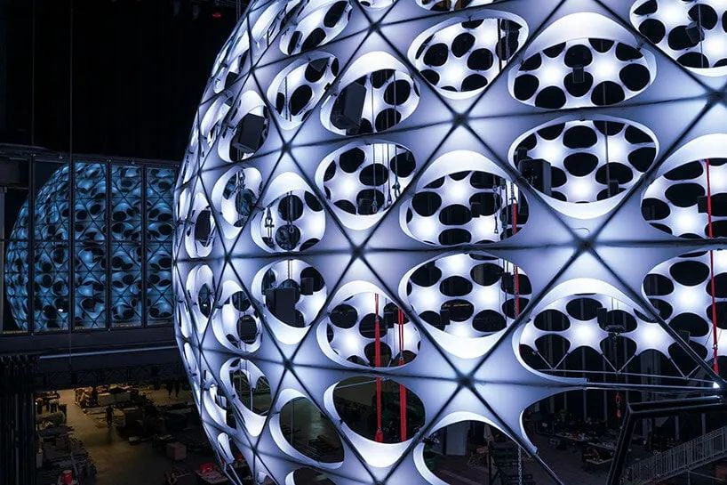 在球體內(nèi)部,250名觀眾將聚集在特別設(shè)計(jì)的聆聽(tīng)平臺(tái)上,該平臺(tái)高出地面34 英尺,圍繞著中央網(wǎng)絡(luò)。“空間化音景”由一百多個(gè)揚(yáng)聲器組成,這些揚(yáng)聲器將聲音在人們的身體上方、下方穿過(guò)和移動(dòng),球體表面的動(dòng)態(tài)照明讓這場(chǎng)超真實(shí)的多感官之旅更加動(dòng)感、炫酷。