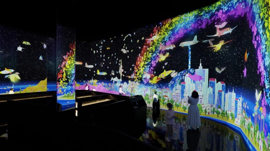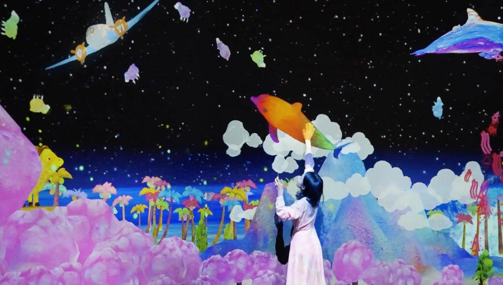 Sketch Umwelt 世界使用了teamLab擅長的實時渲染技術(shù)、圖像識別與投影系統(tǒng),讓平面畫作變?yōu)閯討B(tài)角色。這個過程近乎魔術(shù)般神奇,尤其對于孩子來說,是一次充滿想象力的“畫變活了”的體驗。
