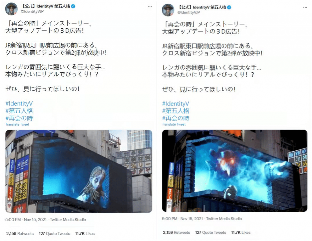 近日,在日本,最為喧鬧的街頭之一東京新宿,上演了備受關(guān)注的《第五人格·再會之時》裸眼3D大屏秀,預(yù)告揭秘全球期待的主線劇情:黑偵探真相、小女孩下落和莊園終極謎團,等精彩劇情!形成極高熱度!