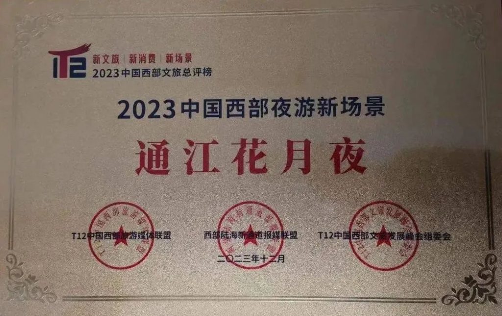 2023年11月,在第四屆T12中國西部文旅發展峰會上,通江花月夜獲評2023中國西部夜游新場景,是全省唯一入選此次獎項的文旅景點。
